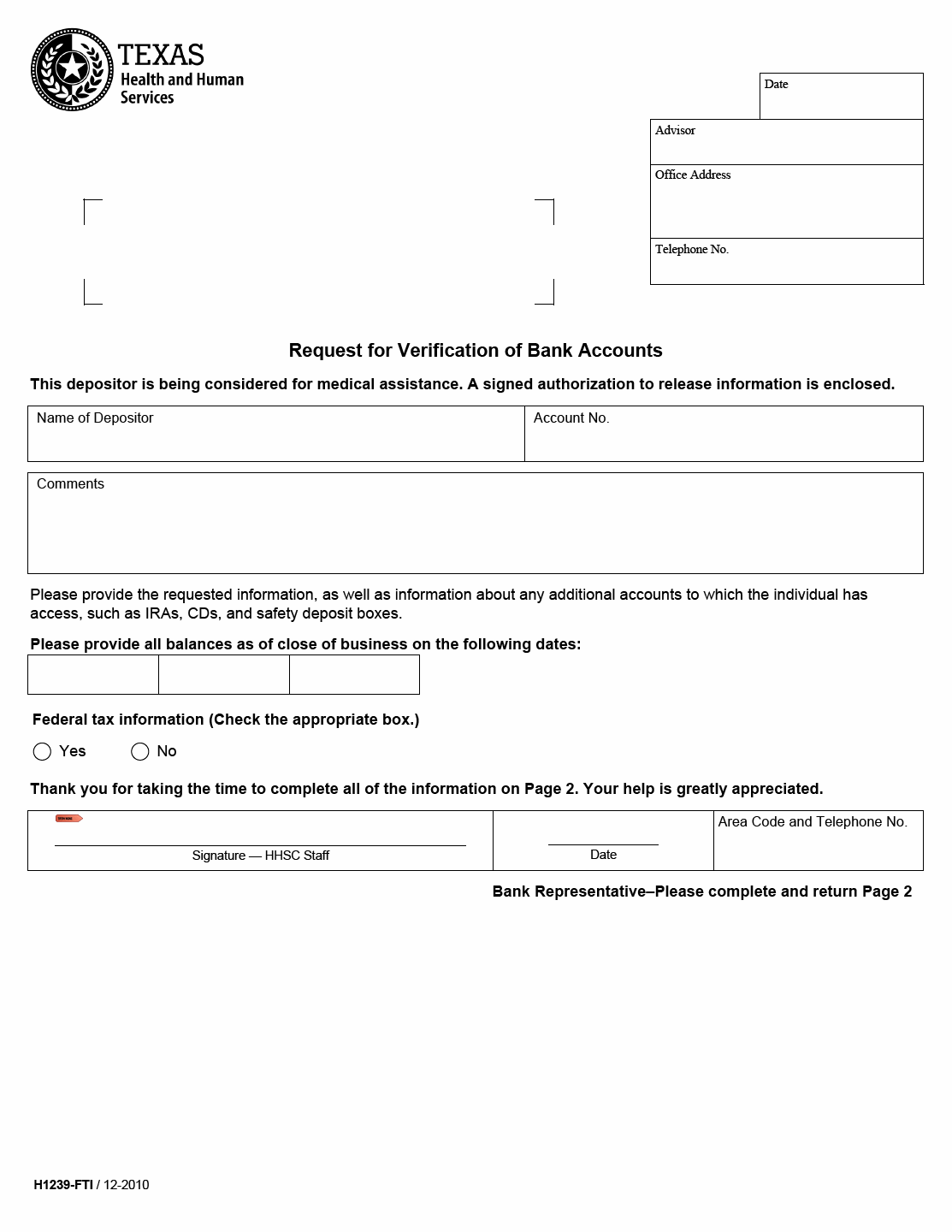 TX HHS Form H1239-FTI. Request for Verification of Bank Accounts - FTI