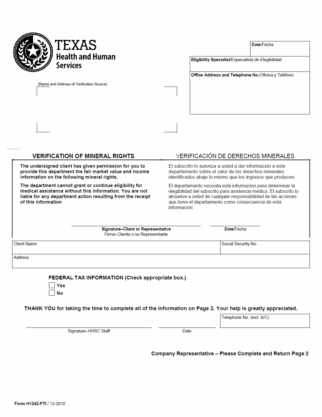 TX HHS Form H1242-FTI. Verification of Mineral Rights - FTI