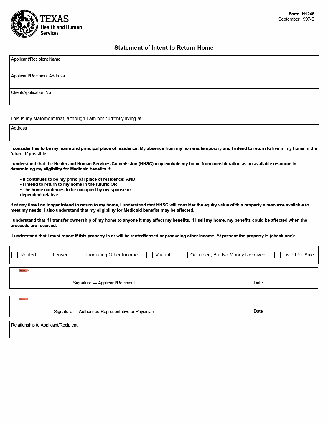 TX HHS Form H1245. Statement of Intent to Return to Home