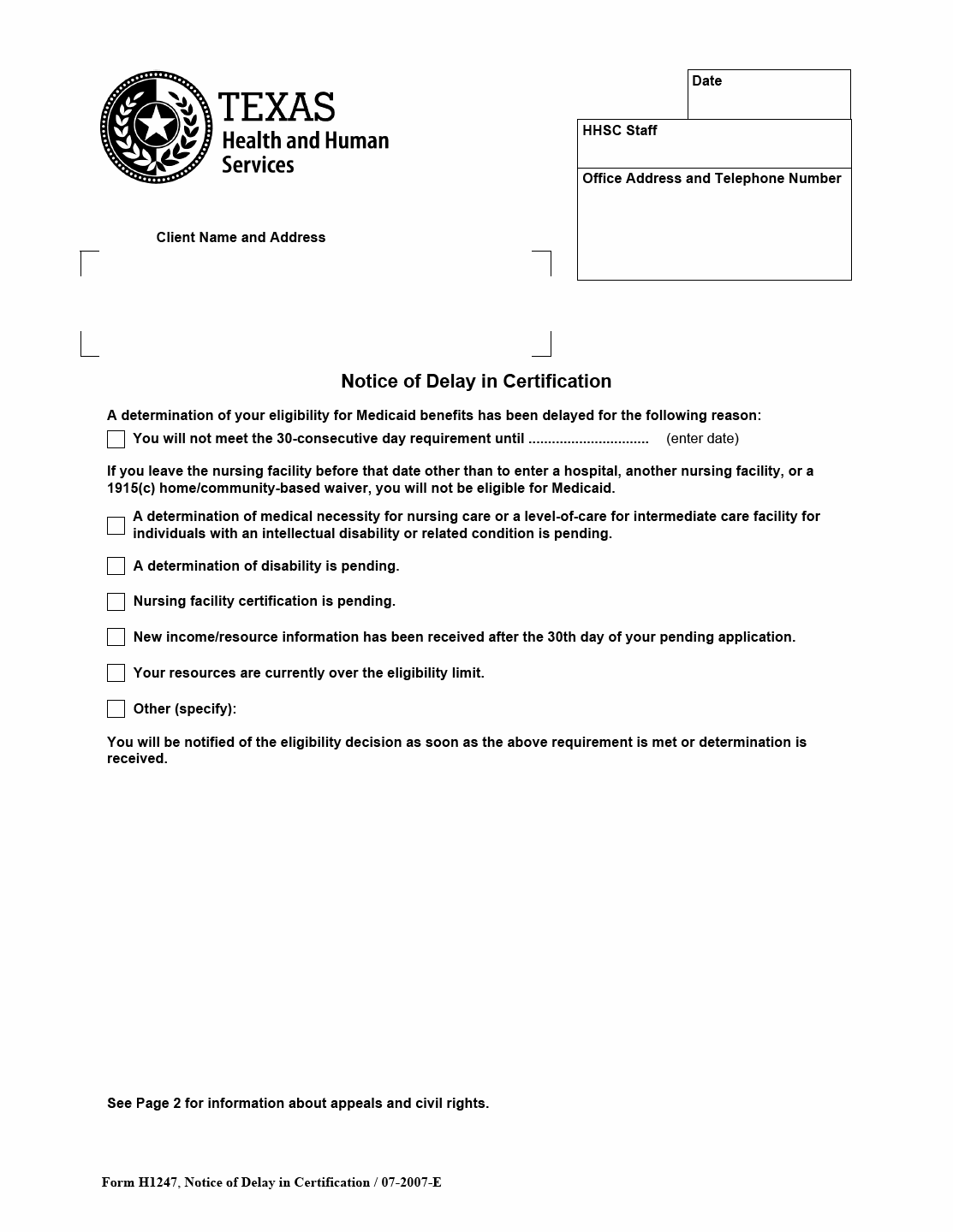 The TX HHS Form H1247, Notice of Delay in Certification, is a crucial document that helps address the issue of delayed certification for Medicaid benefits. This form is typically used by nursing facilities, hospitals, or other healthcare providers who need to notify clients of delays in their certification process.