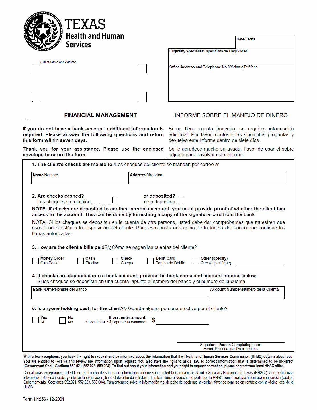 The Financial Management Form H1256 helps individuals or organizations manage financial transactions related to client services. This form is typically used in situations where clients receive payments or have their bills paid on their behalf. The form requires information about the client's checks, including whether they are cashed or deposited, and how their bills are paid.
