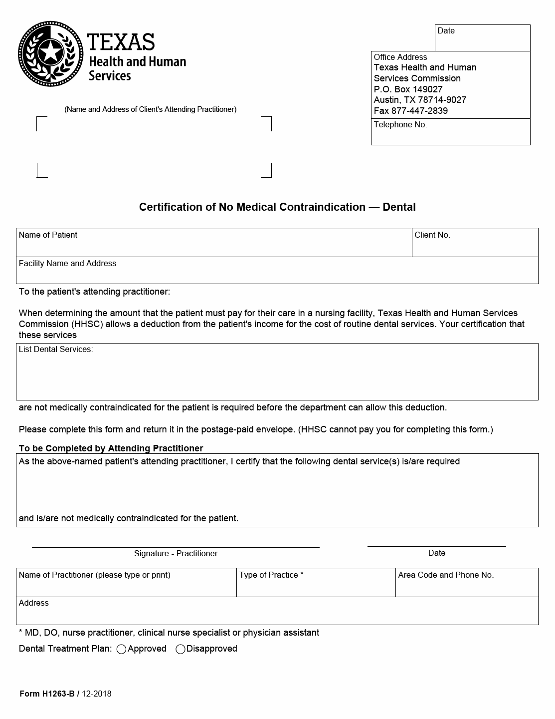 TX HHS Form H1263-B. Certification of No Medical Contraindication - Dental
