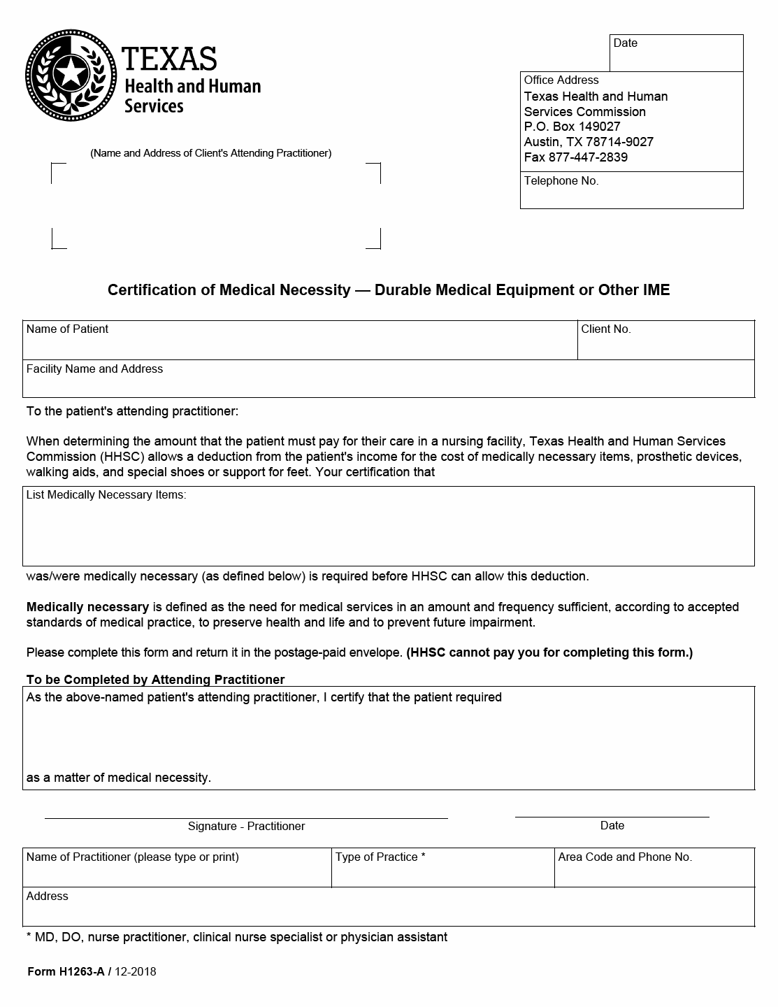 TX HHS Form H1263-A. Certification of Medical Necessity - Durable Medical Equipment or Other IME