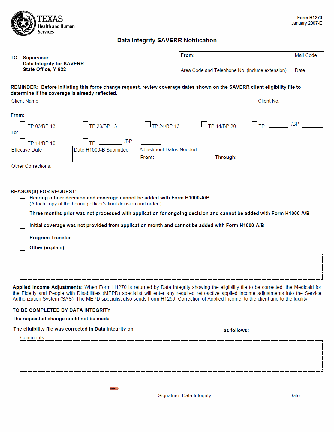 TX HHS Form H1270. Data Integrity SAVERR Notification