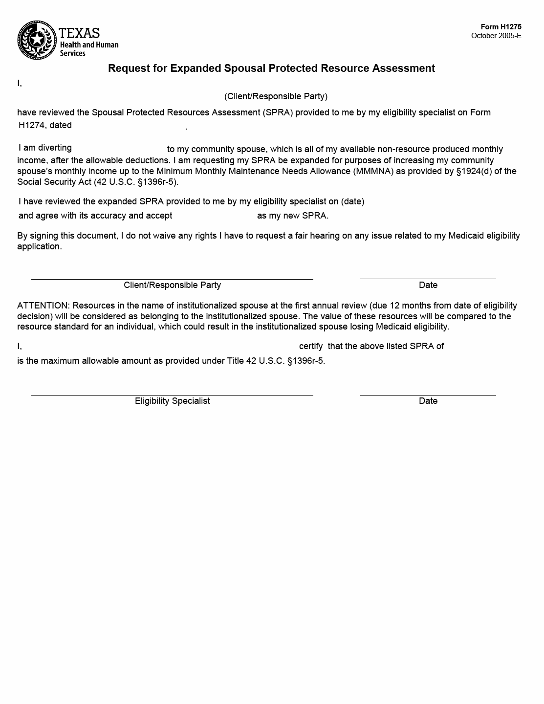 This form requires the client/responsible party to review and agree with the accuracy of their SPRA, which outlines all available non-resource produced monthly income after allowable deductions. The client must also certify that the listed SPRA is the maximum allowable amount as provided under Title 42 U.S.C. §1396r-5. By signing this document, the client does not waive any rights to request a fair hearing on any issue related to their Medicaid eligibility application.