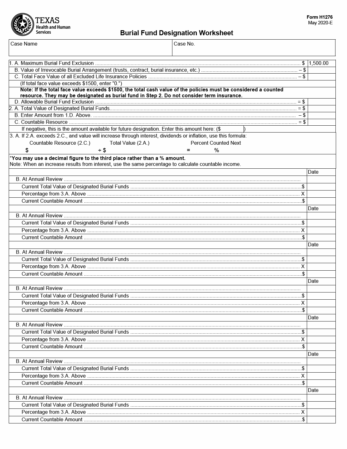 - The Burial Fund Designation Worksheet (Form H1276) is used to determine countable resources for government benefit programs such as Medicaid and SSI.