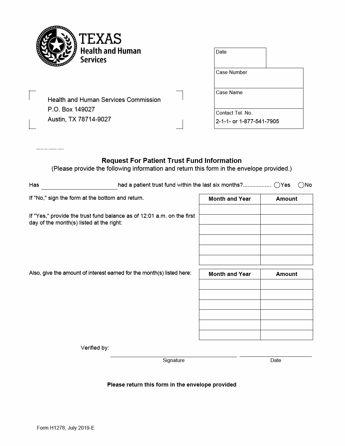 TX HHS Form H1278. Request for Patient Trust Fund Information