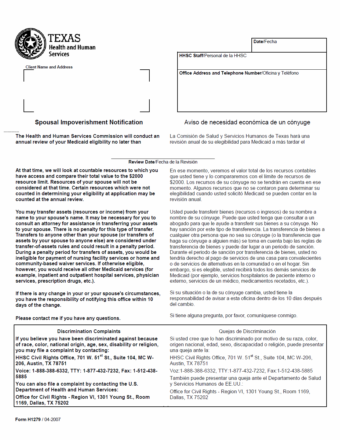 TX HHS Form H1279. Spousal Impoverishment Notification