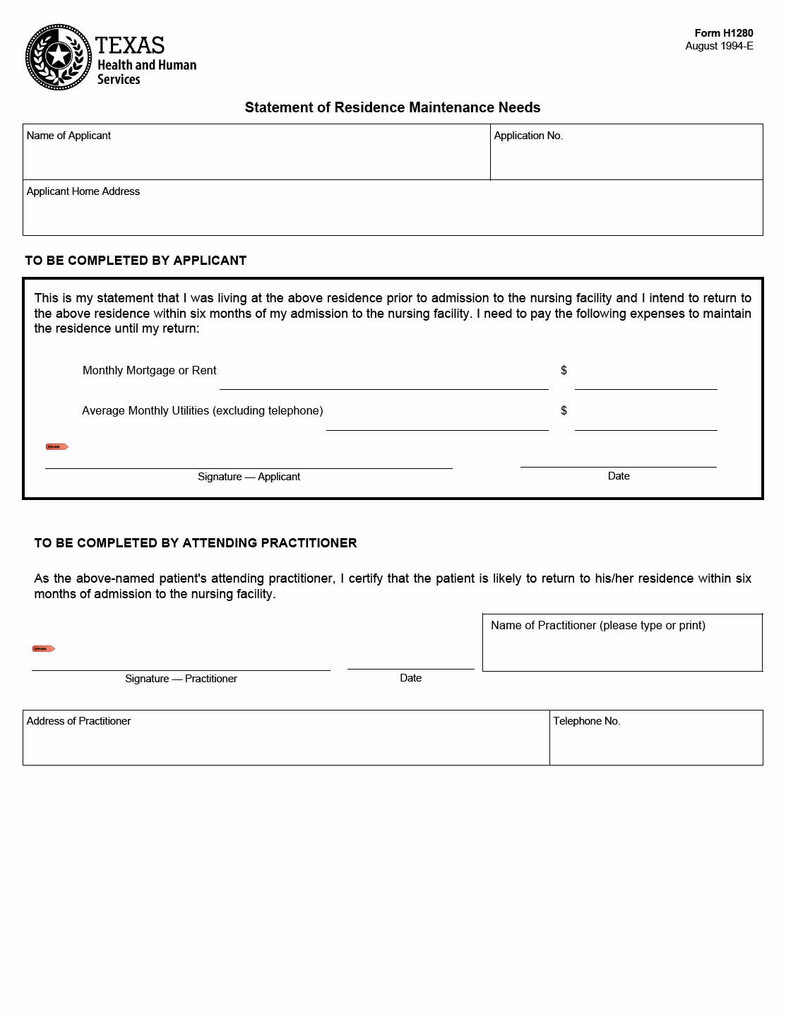 TX HHS Form H1280. Statement of Residence Maintenance Needs