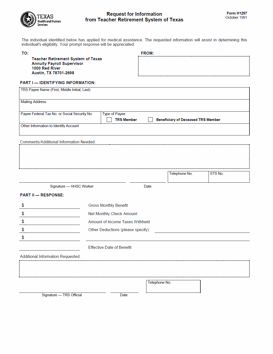 TX HHS Form H1297. Request for Information from Teacher Retirement System of Texas