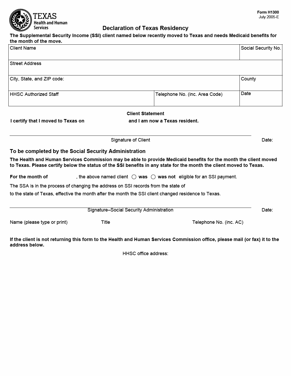 This declaration requires key information from the client, including their name, social security number, street address, city, state, and ZIP code. The client must also certify that they have moved to Texas and provide a signature and date. Additionally, the Social Security Administration (SSA) section of the form needs completion by SSA staff, indicating the client's eligibility for SSI benefits in any state for the month they moved to Texas.