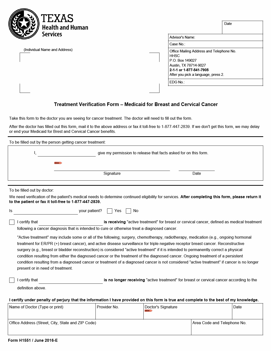 The Treatment Verification Form H1551, issued by Texas Health and Human Services (HHS), is a crucial document for individuals receiving Medicaid benefits for breast and cervical cancer treatment. This form helps verify the patient's medical needs to determine continued eligibility for services.