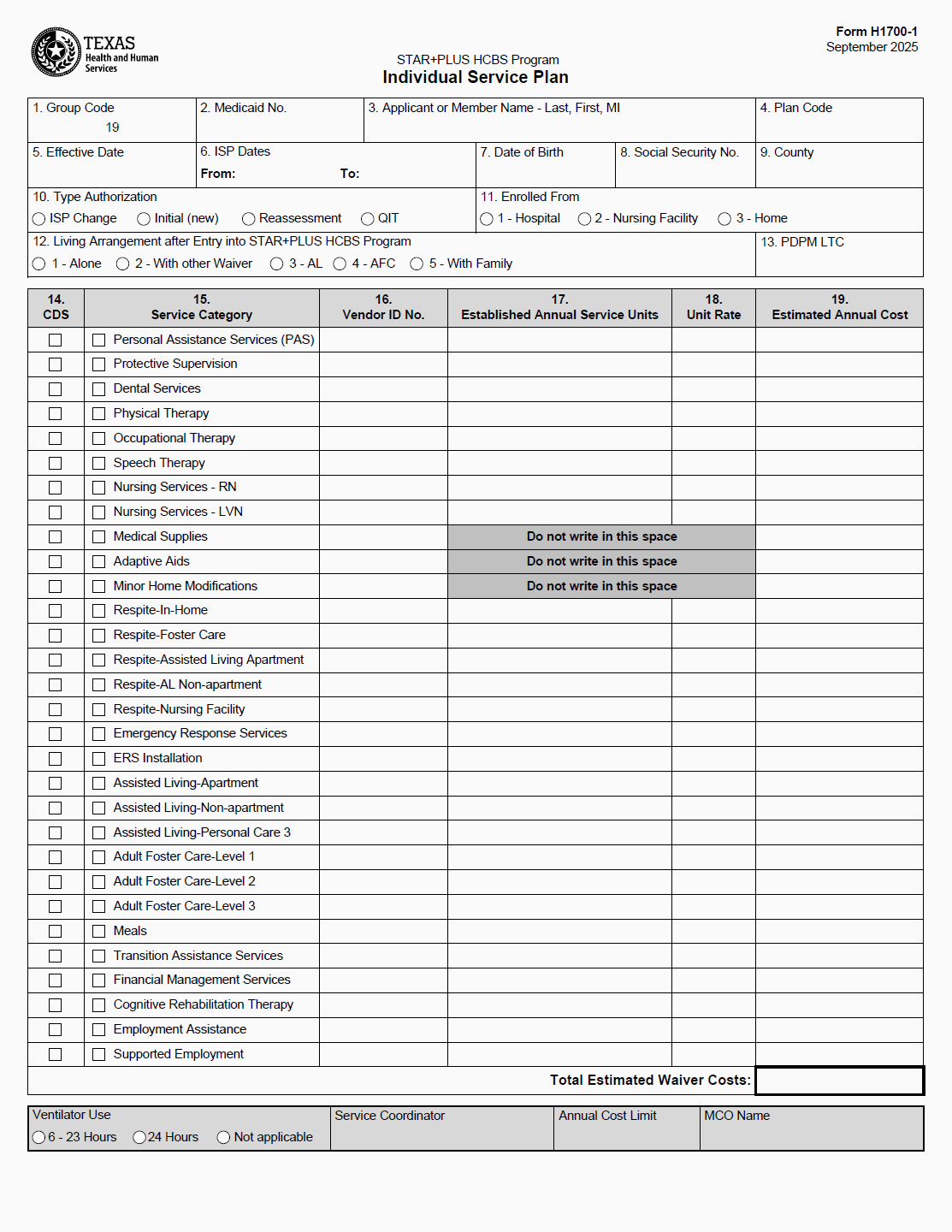 TX HHS Form H1700-1. STAR PLUS HCBS Program Individual Service Plan