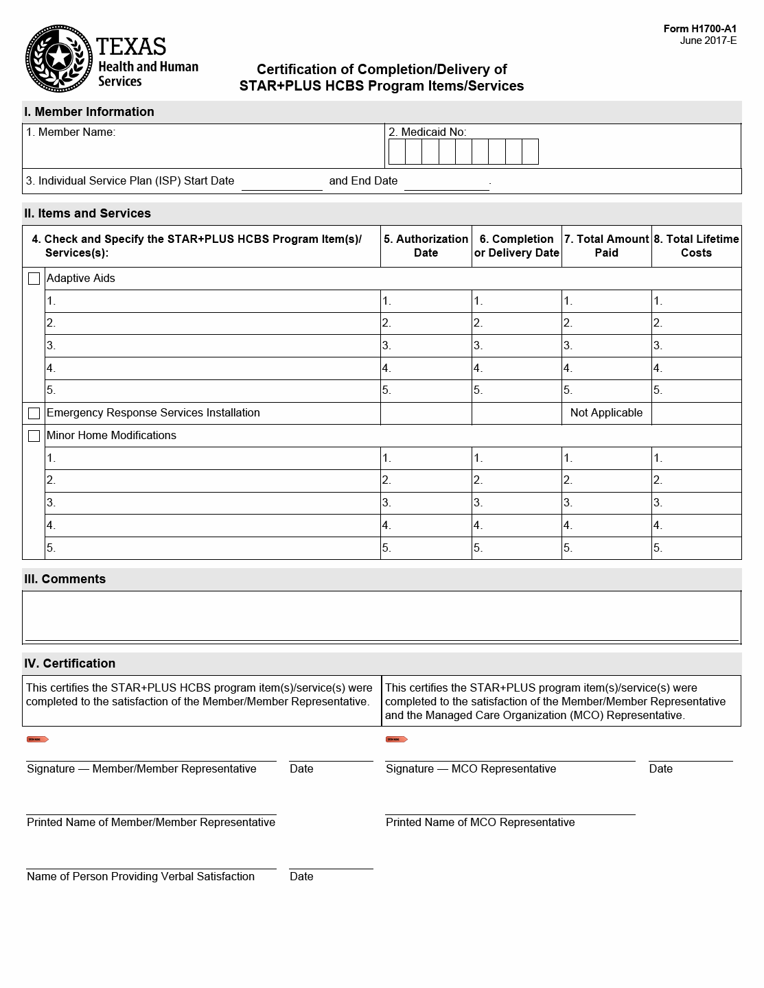 TX HHS Form H1700-A1. Certification of Completion/Delivery of STAR+PLUS HCBS Program Items/Services
