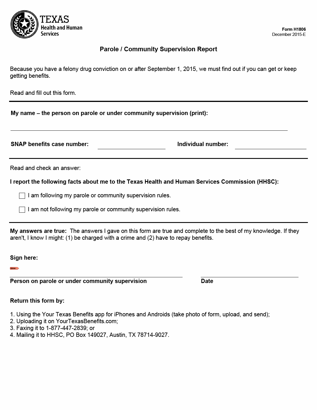 The TX HHS Form H1806, Parole or Community Supervision Report, is a crucial document that helps individuals with felony drug convictions on or after September 1, 2015, report their compliance with parole or community supervision rules. This form is typically filled out by individuals who are currently serving a sentence or under the supervision of a parole officer.
