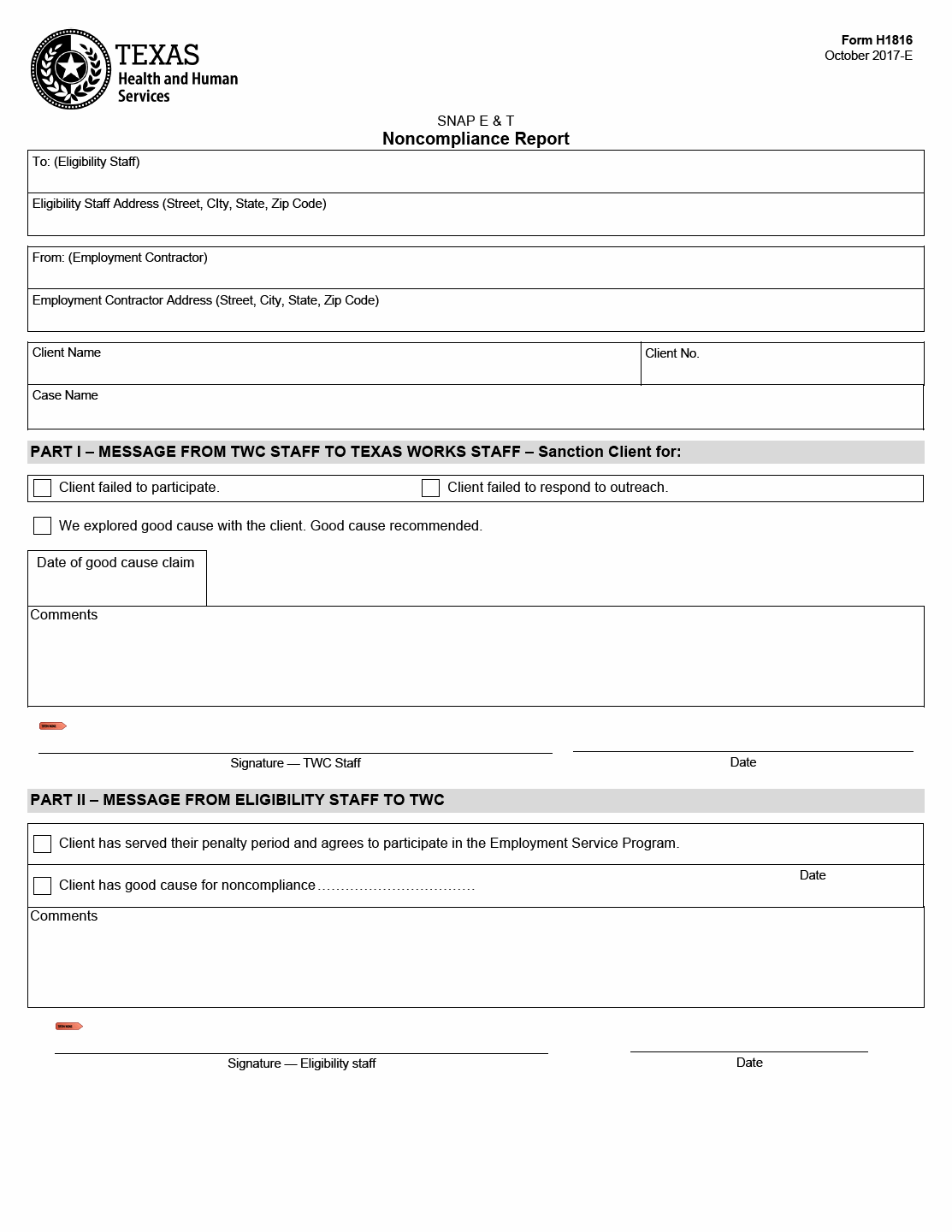 TX HHS Form H1816. SNAP Employment and Training Noncompliance Report
