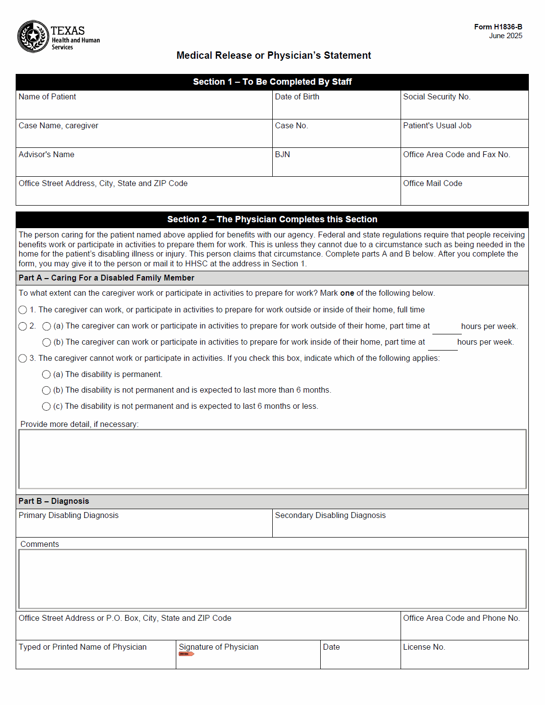 TX HHS Form H1836-B. Medical Release or Physician's Statement