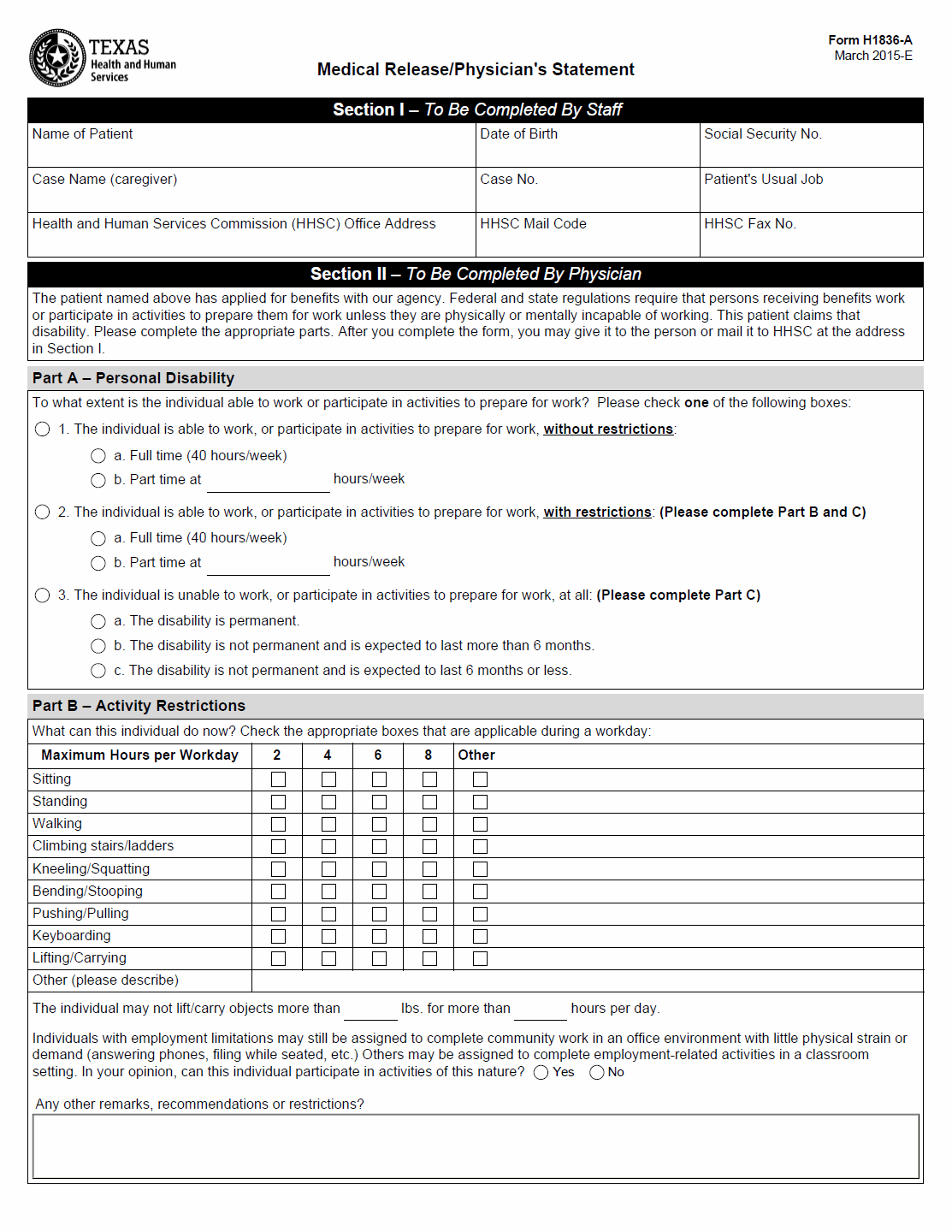 TX HHS Form H1836-A. Medical Release and Physician's Statement