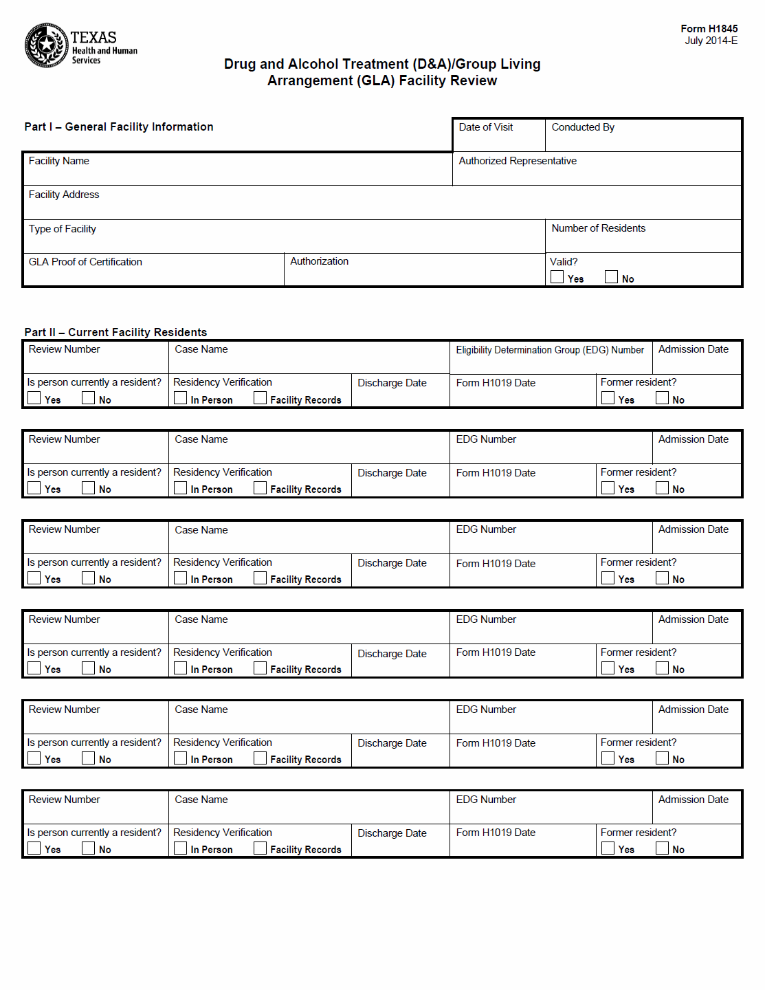 TX HHS Form H1845. Drug and Alcohol Treatment (D&A) and Group Living Arrangement (GLA) Facility Review