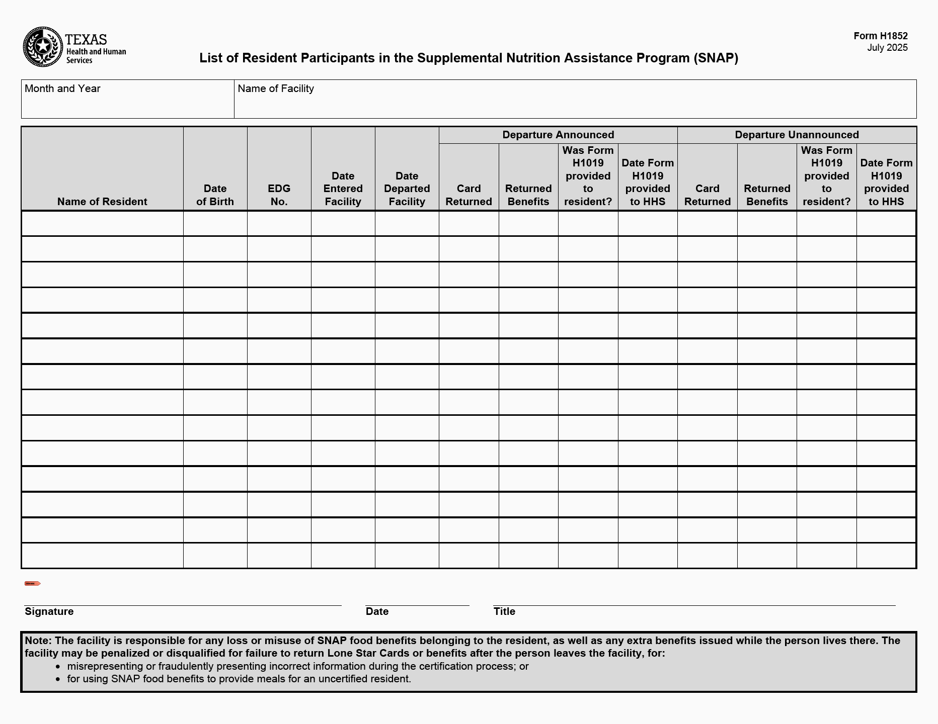 TX HHS Form H1852. List of Resident Participants in the Supplemental Nutrition Assistance Program (SNAP)