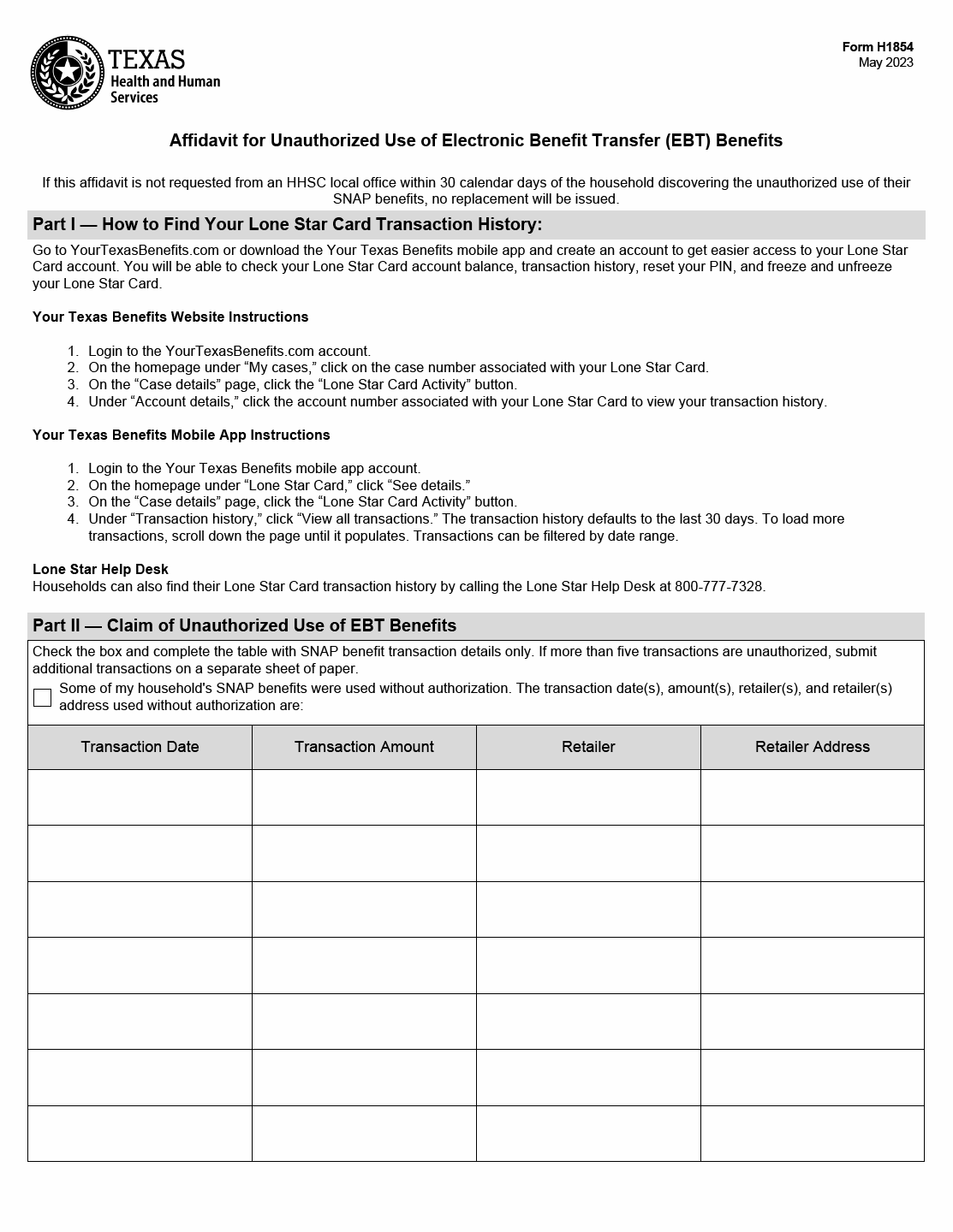 TX HHS Form H1854. Affidavit for Unauthorized Use of Electronic Benefit Transfer (EBT) Benefits