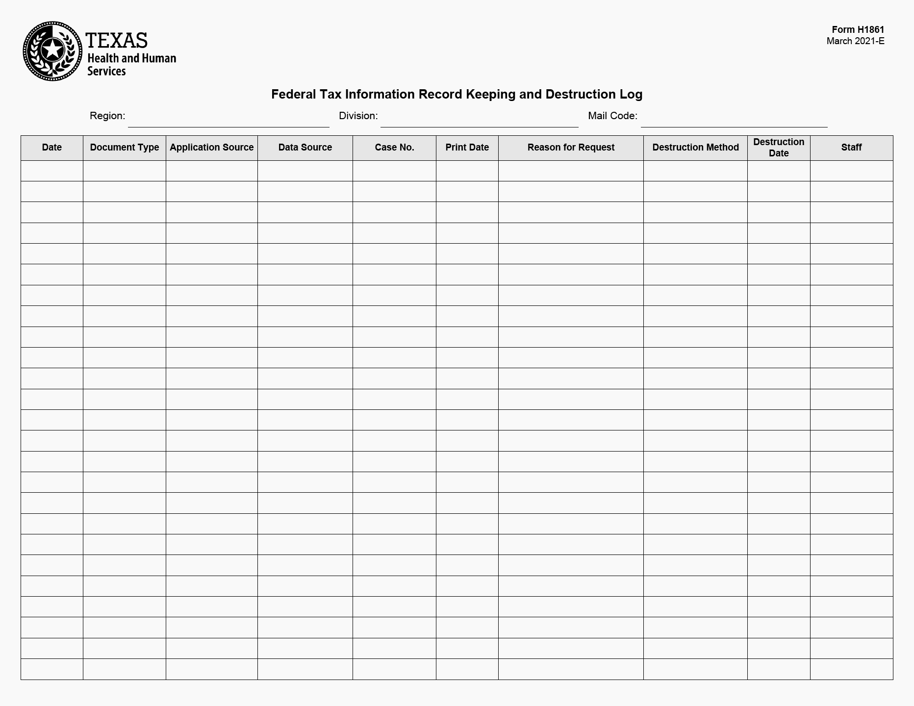 TX HHS Form H1861. Federal Tax Information Record Keeping and Destruction Log