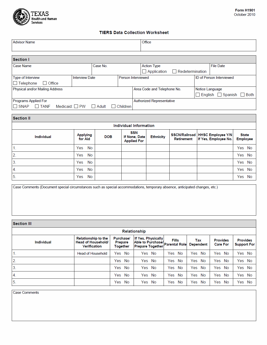 TX HHS Form H1901. TIERS Data Collection Worksheet