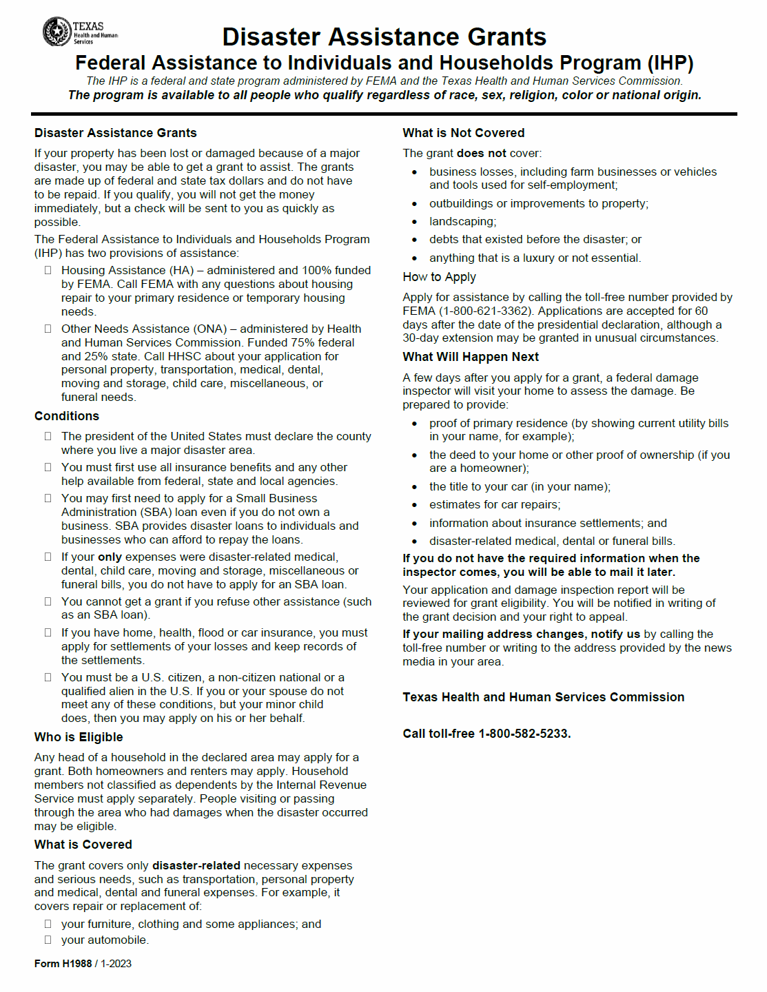 The TX HHS Form H1988, Disaster Assistance Grants, provides financial assistance to individuals and households affected by a major disaster. The form is administered by the Federal Emergency Management Agency (FEMA) and the Texas Health and Human Services Commission (HHS). It helps solve the problem of providing necessary expenses and serious needs for those who have experienced damage or loss due to a disaster.