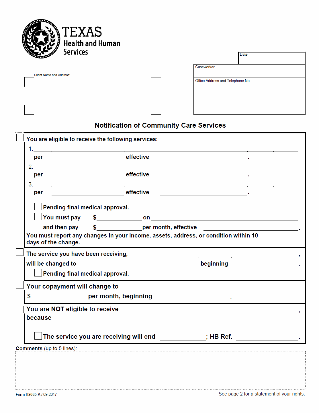 The TX HHS Form H2065-A, Notification of Community Care Services, is a crucial document that helps individuals notify the relevant authorities about changes in their community care services. This form is typically filled out by health and human caseworkers or individuals who are receiving community care services.