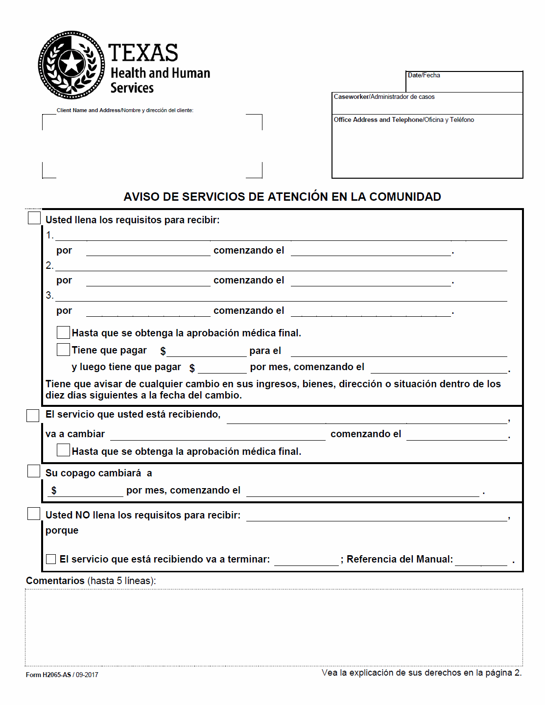 The TX HHS Form H2065-A, Notification of Community Care Services, helps individuals notify the Texas Health and Human Services (HHS) of changes in their community care services. This form is typically used by caseworkers or administrators to inform clients of service changes, including copayment adjustments.