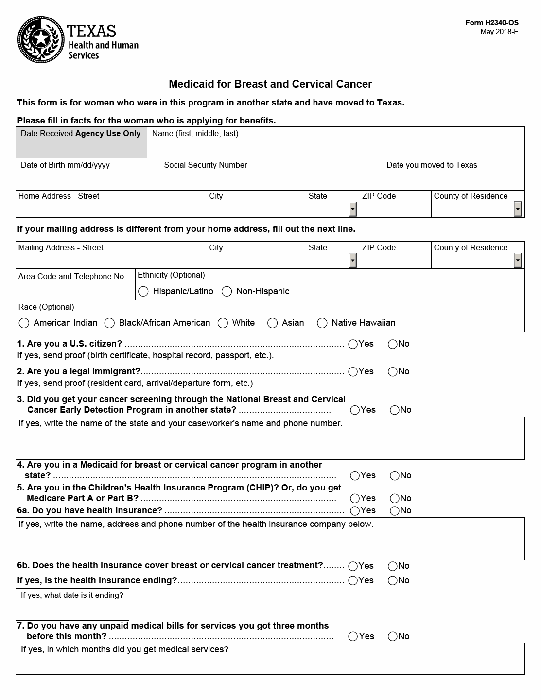 - Q: Who can fill out Form H2340-OS? A: Women eligible for Medicaid for Breast and Cervical Cancer who have moved to Texas.