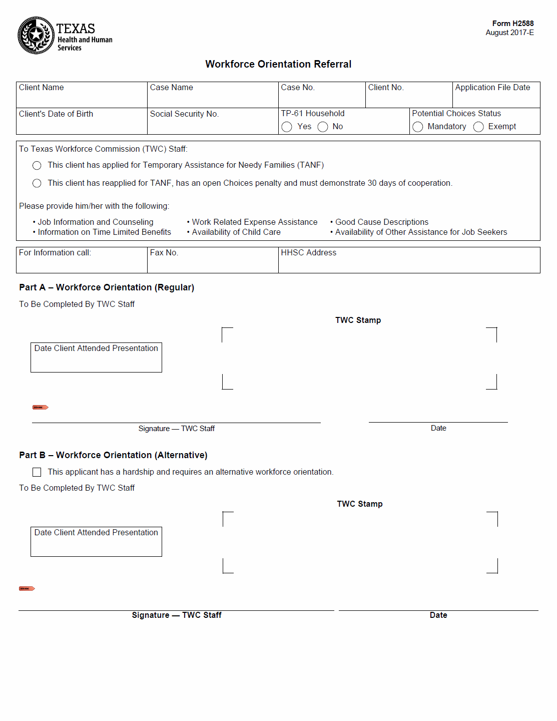 The TX HHS Form H2588, Workforce Orientation Referral, is a crucial document that helps solve the problem of ensuring clients receive necessary job training and counseling services. This form is typically used in situations where individuals are applying for or reapplying for Temporary Assistance for Needy Families (TANF) benefits.