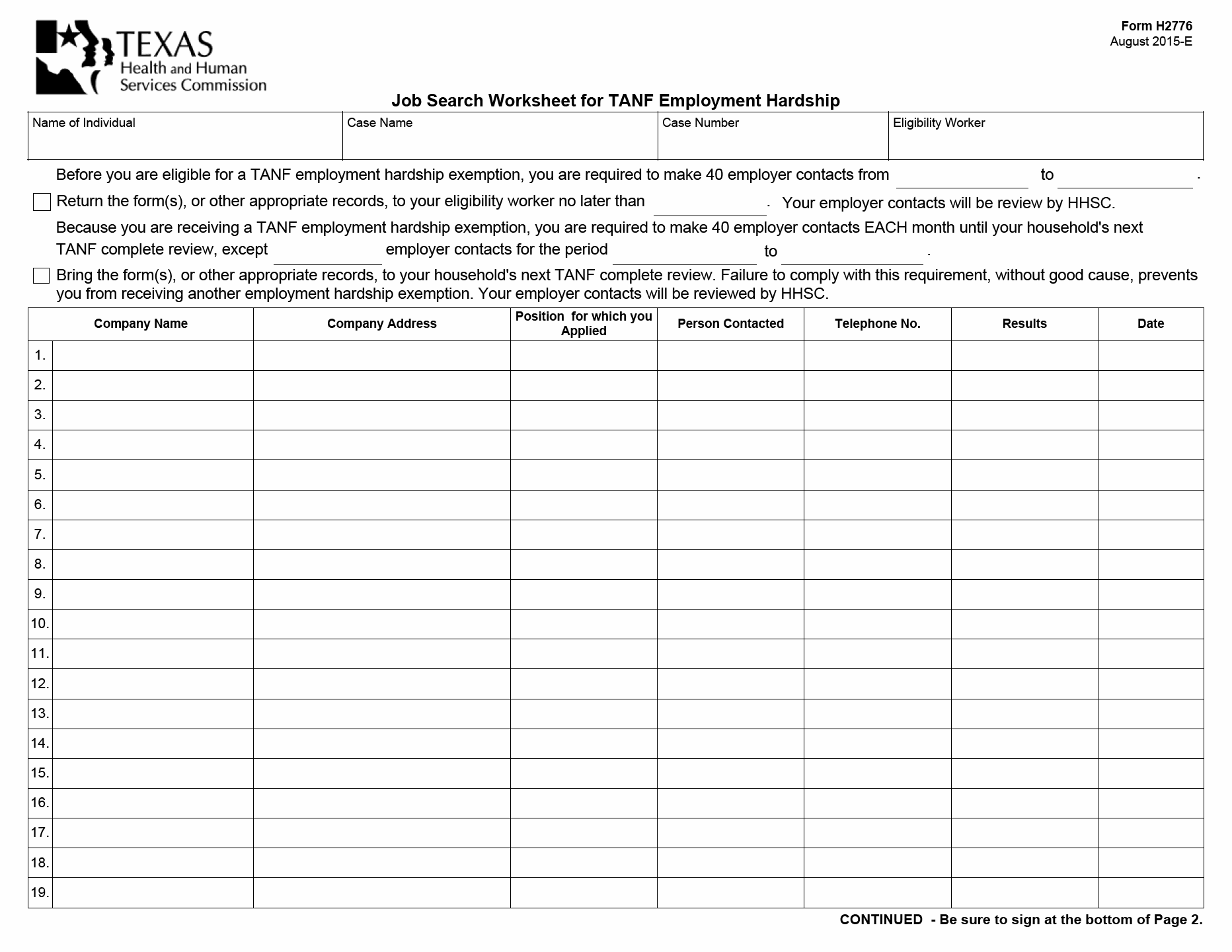TX HHS Form H2776. Job Search Worksheet for TANF Employment Hardship Exemption