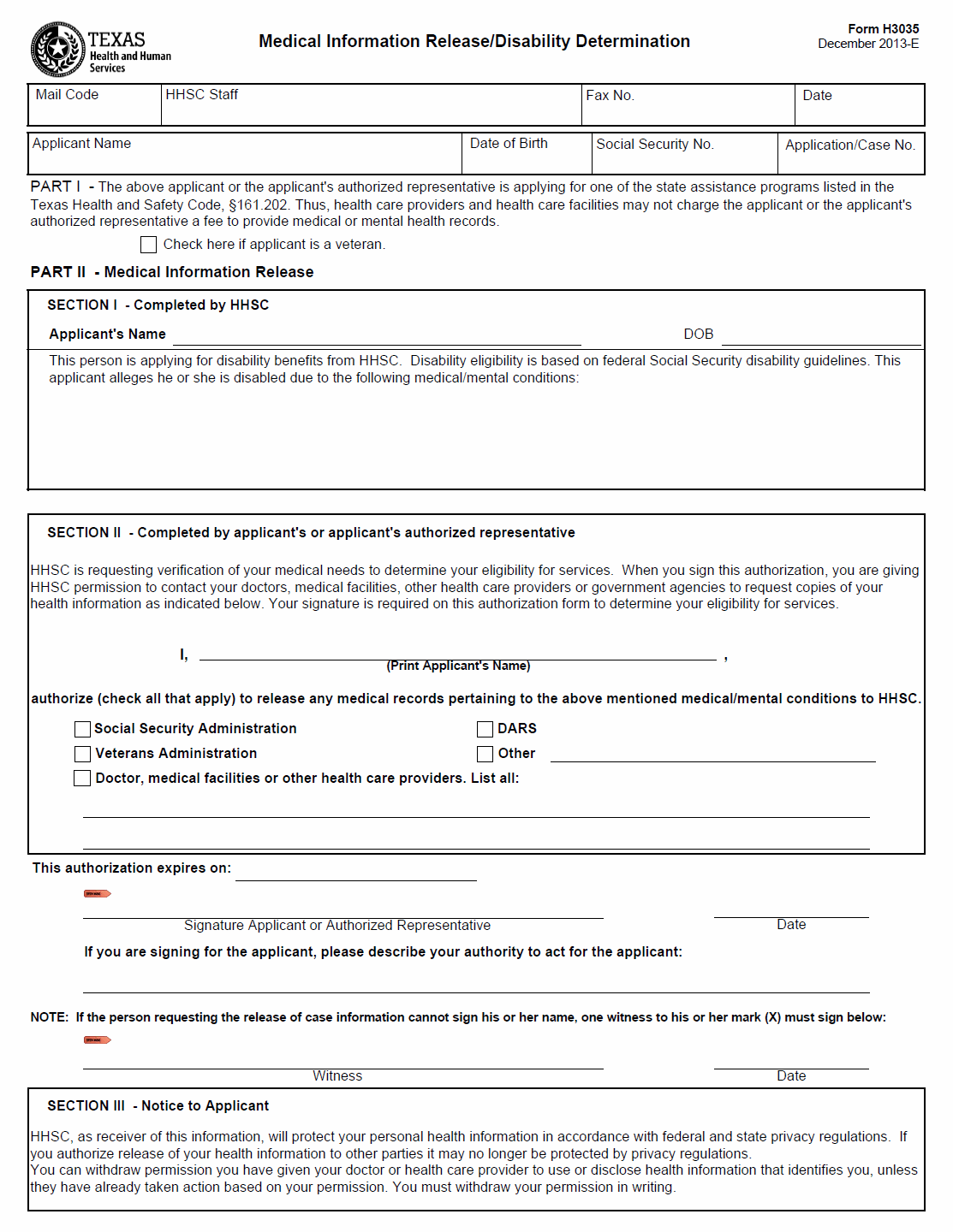TX HHS Form H3035. Medical Information Release and Disability Determination