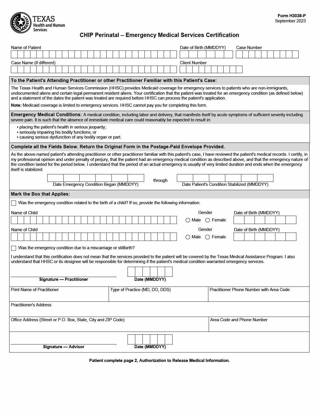TX HHS Form H3038-P. CHIP Perinatal - Emergency Medical Services Certification