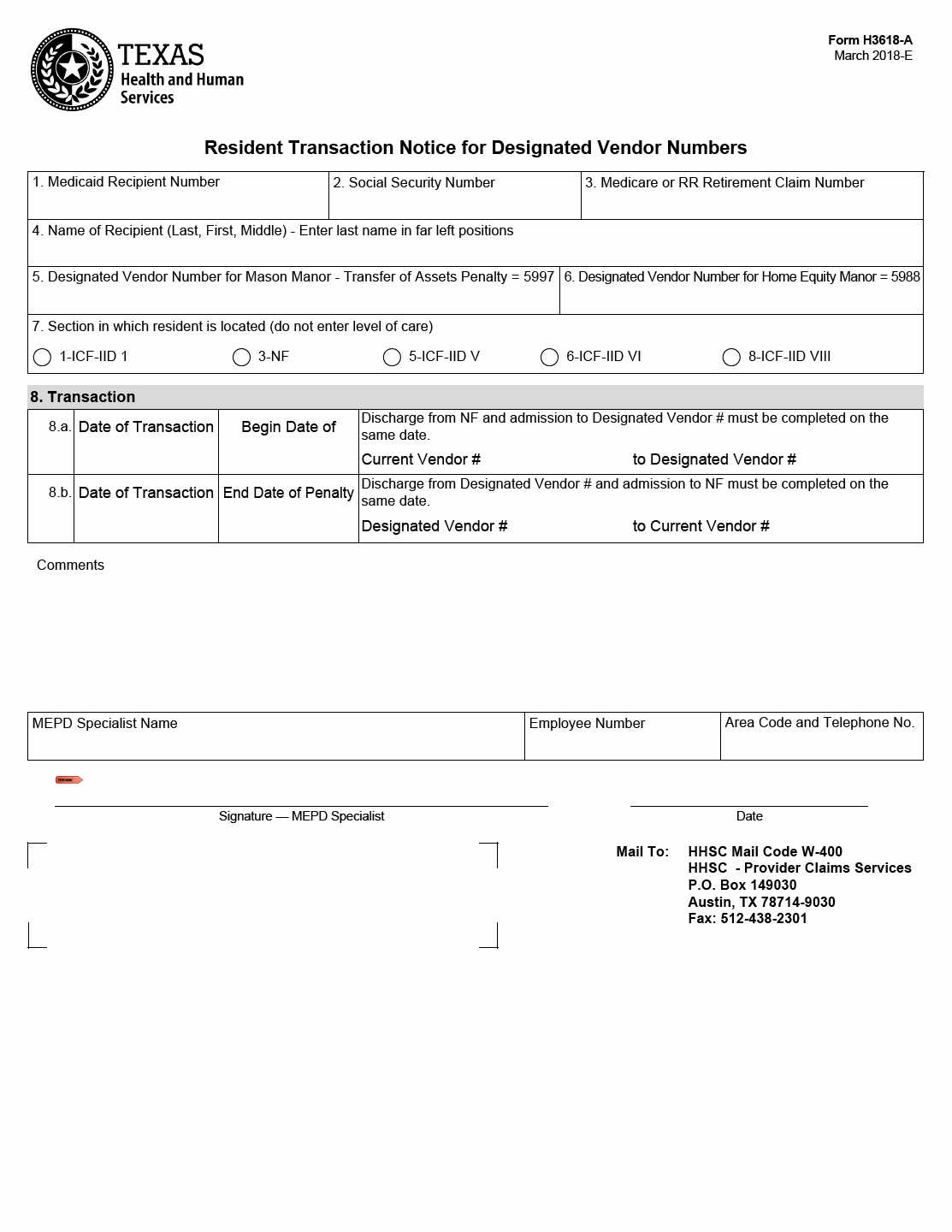 TX HHS Form H3618-A. Resident Transaction Notice for Designated Vendor Numbers