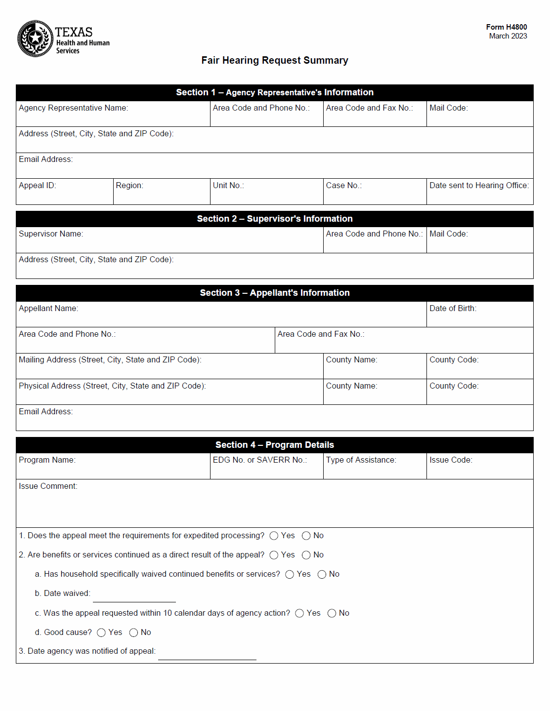 TX HHS Form H4800. Fair Hearing Request Summary