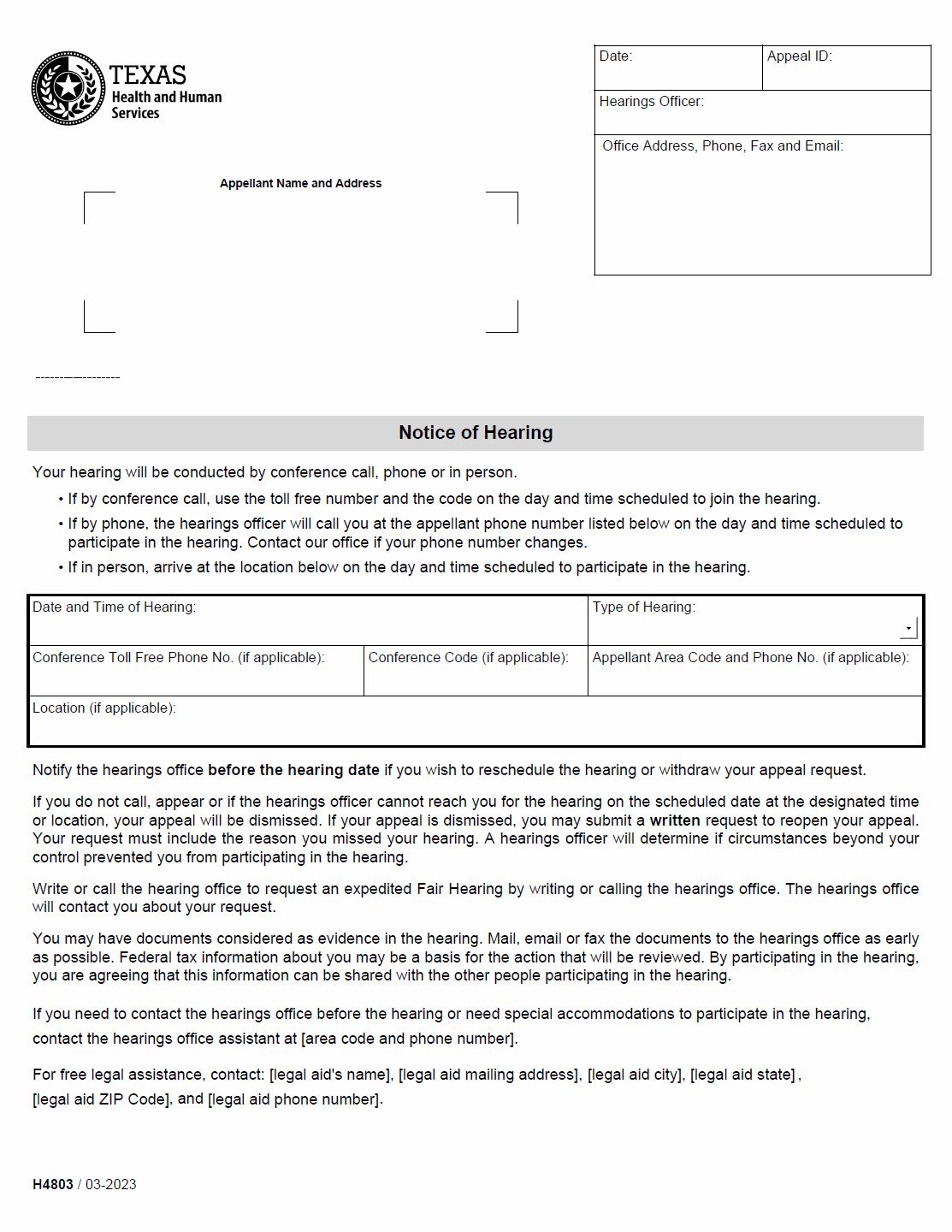TX HHS Form H4803. Notice of Hearing