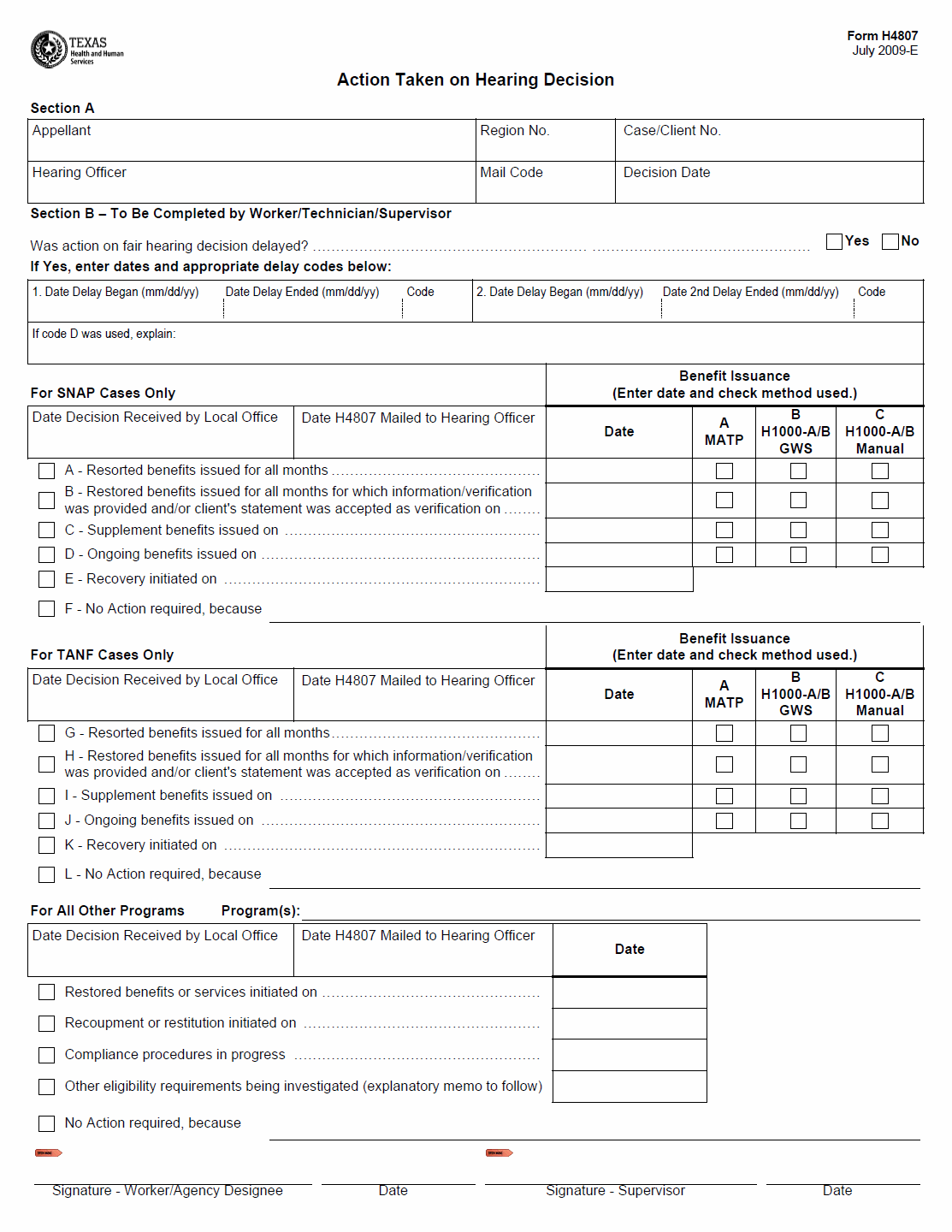 TX HHS Form H4807. Action Taken on Hearing Decision