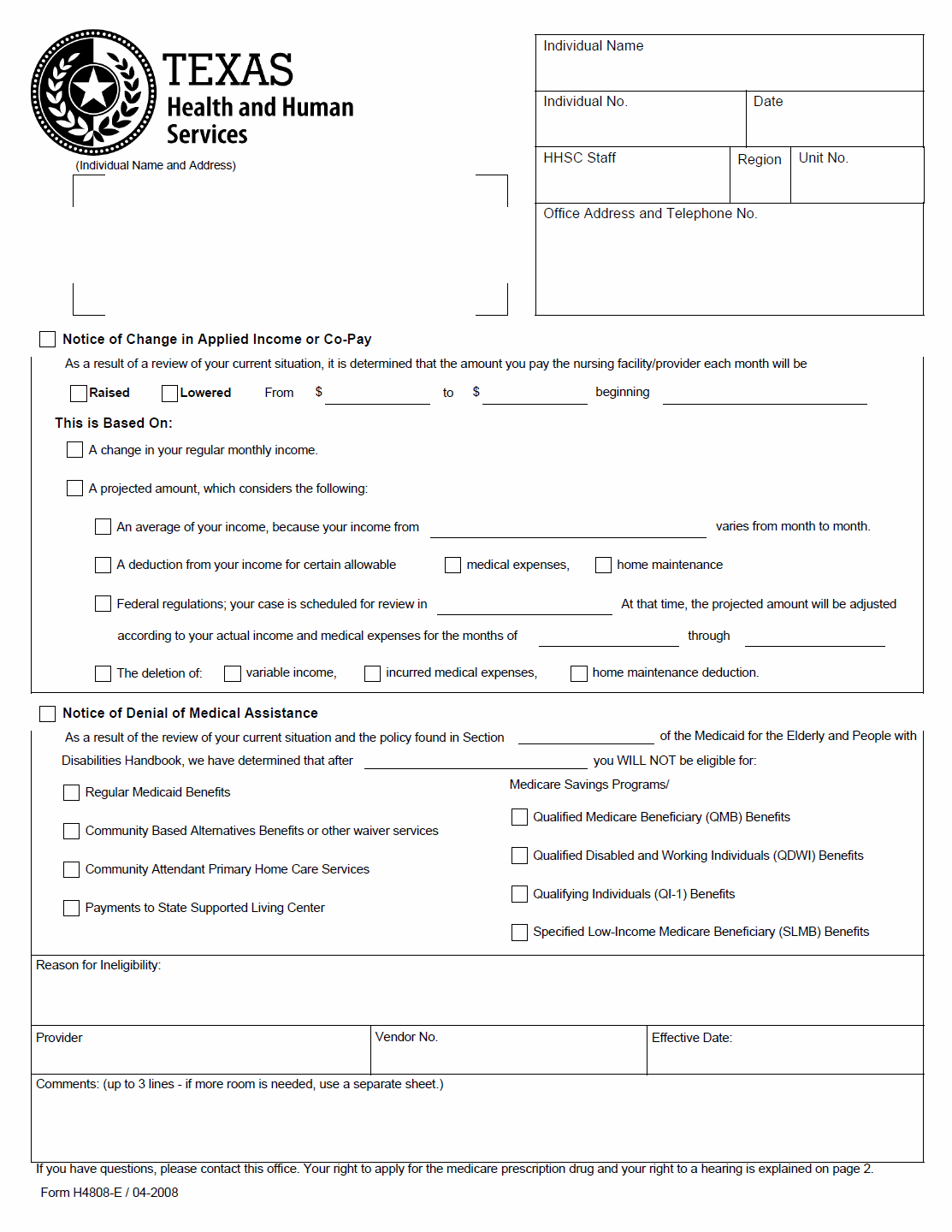 TX HHS Form H4808. Notice of Change in Applied Income/Notice of Denial of Medical Assistance