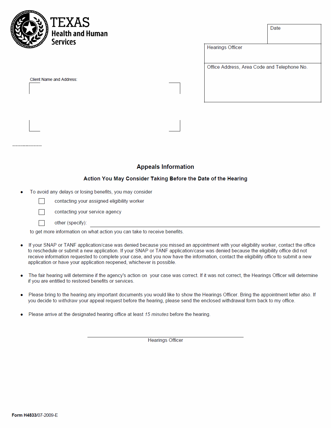The TX HHS Form H4833, Appeals Information, helps individuals navigate the appeals process for denied benefits or services. This form is typically used by clients who have had their SNAP (Supplemental Nutrition Assistance Program) or TANF (Temporary Assistance for Needy Families) application or case denied.
