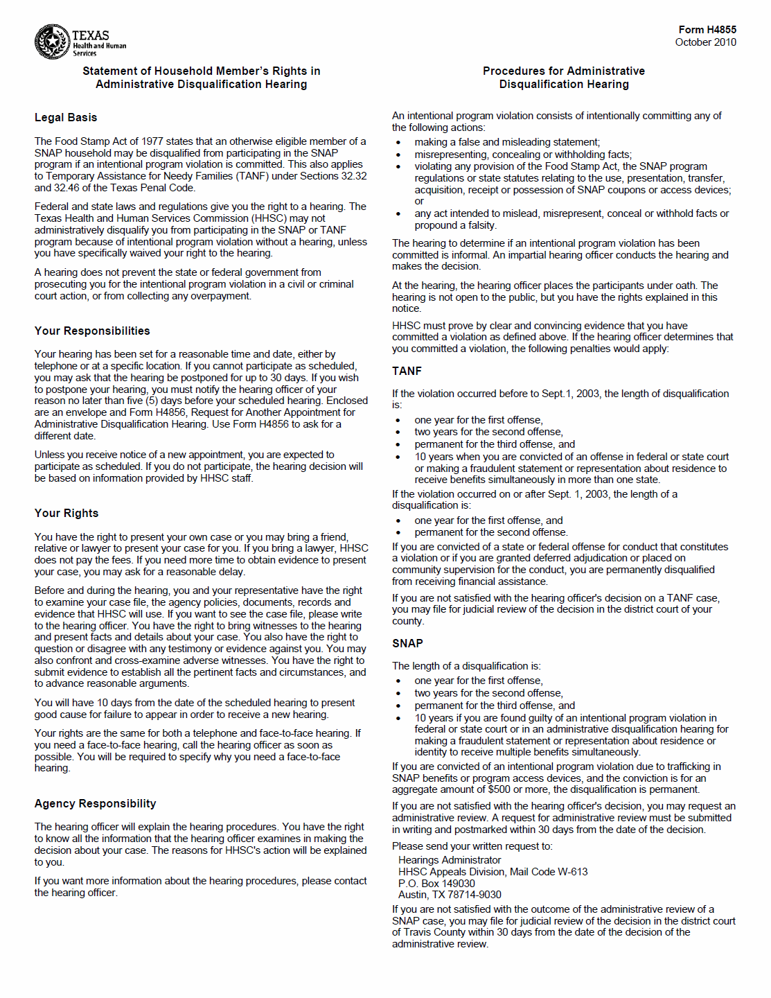 TX HHS Form H4855. Statement of Household Member's Rights in Administrative Disqualification Hearing