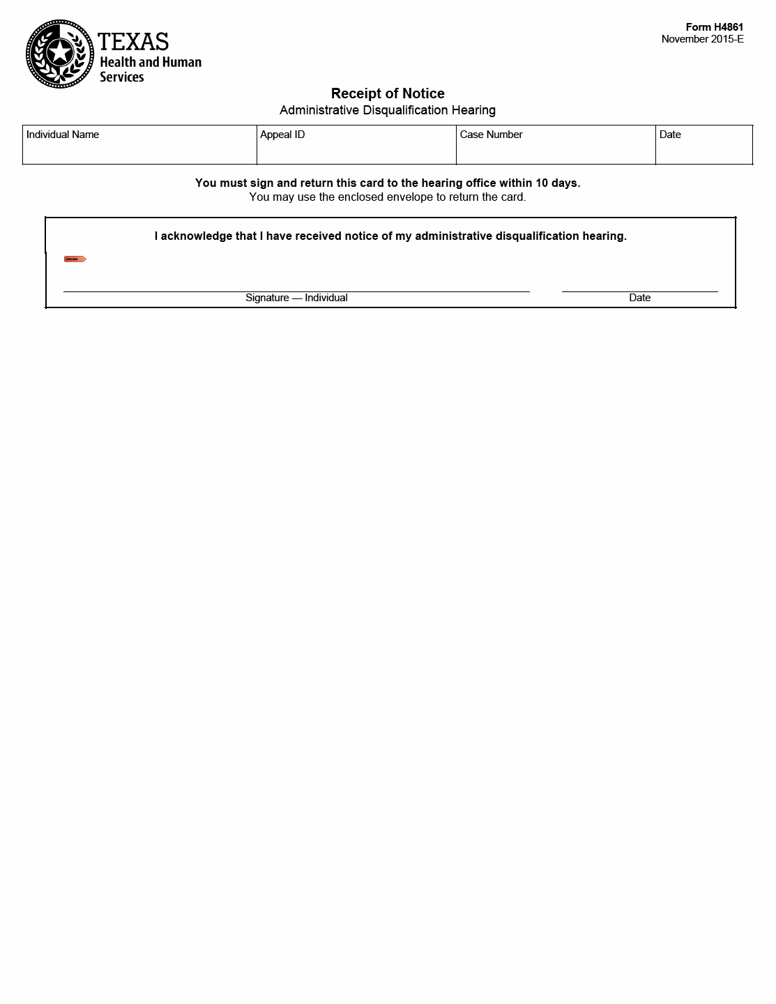 The TX HHS Form H4861, Receipt of Notice, is a crucial document that helps facilitate the administrative disqualification hearing process. This form is typically used in situations where an individual has received notice of their administrative disqualification hearing and must acknowledge receipt within 10 days.