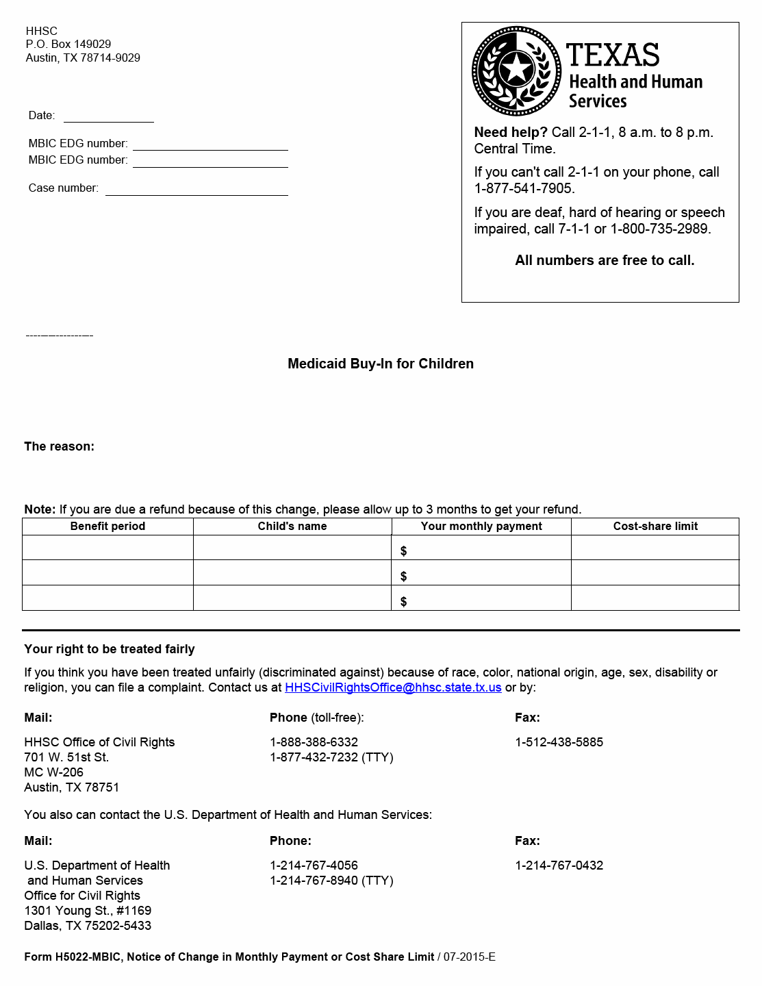 TX HHS Form H5022-MBIC. Notice of Change in Monthly Payment or Cost Share Limit (Medicaid Buy-In for Children)
