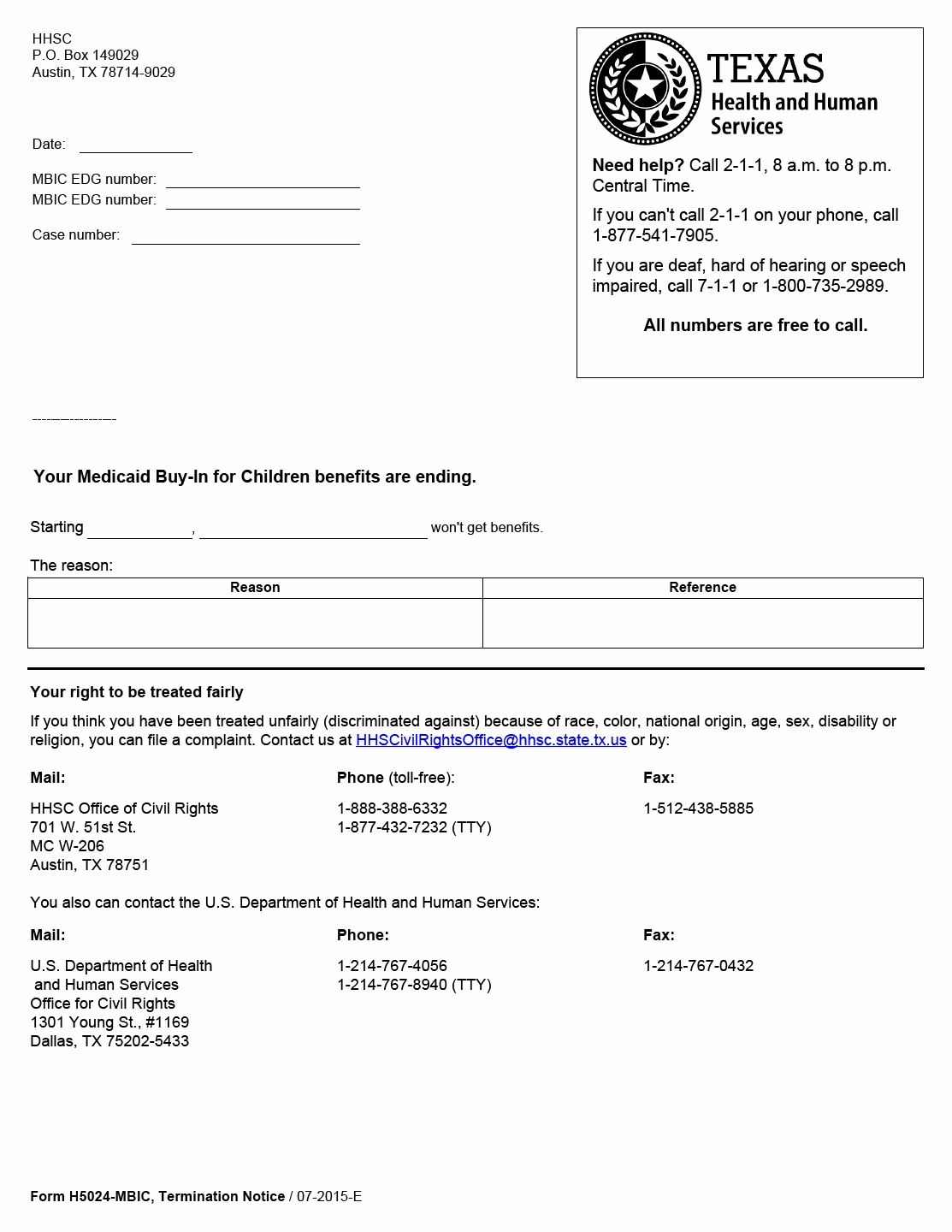 TX HHS Form H5024-MBIC. Termination Notice (Medicaid Buy-In for Children)
