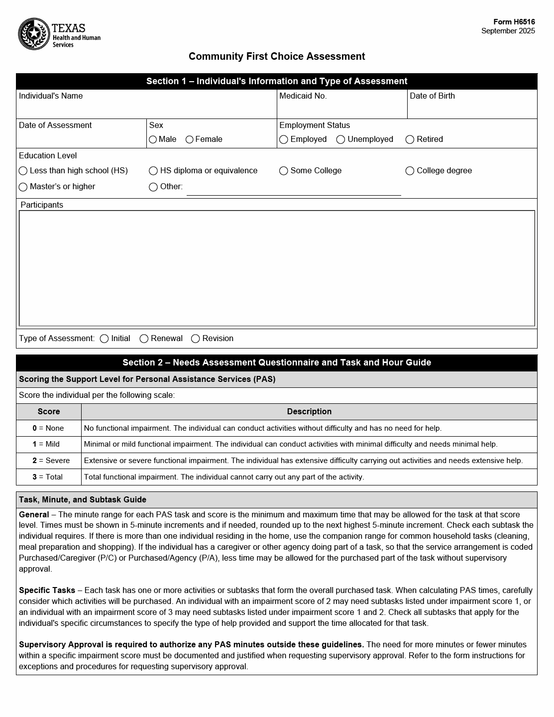 TX HHS Form H6516. Community First Choice Assessment