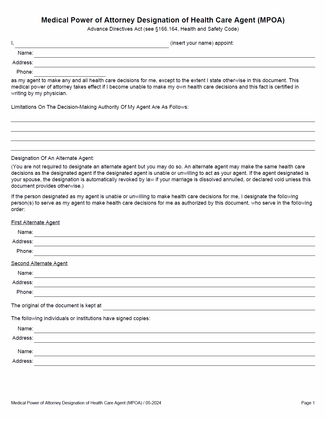 The Medical Power of Attorney Designation of Health Care Agent (MPOA) is a crucial document that helps ensure your healthcare decisions are respected in the event you become unable to make them yourself. This form is typically used by individuals who want to appoint a trusted agent to make medical decisions on their behalf, should they lose capacity due to illness or injury.