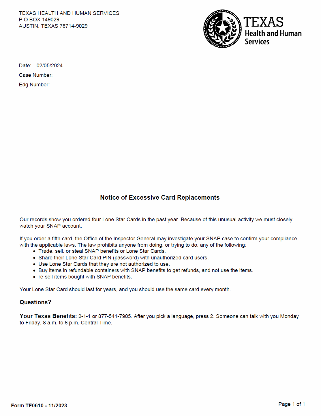 TX HHS Notice TF0610. Notice of Excessive Card Replacements