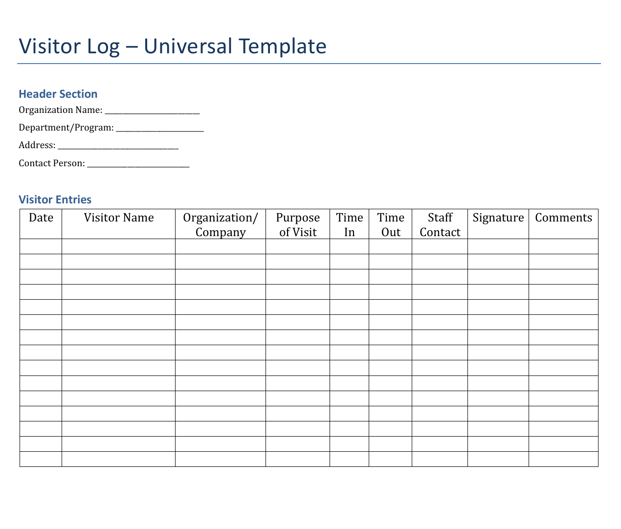 - Ensure all required fields are filled: visitor name, organization, purpose, time in/out, staff contact, and signature