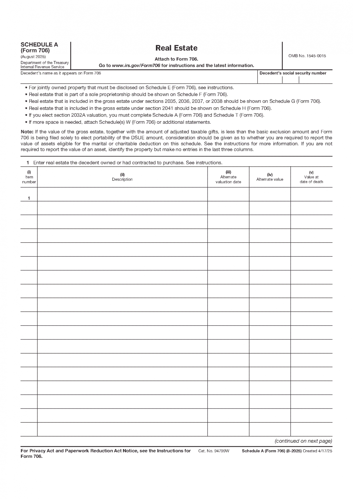 The formal role of Form 706 and its schedules is defined on the IRS Form 706 document page, which describes how individual schedules fit into the official structure of the return.